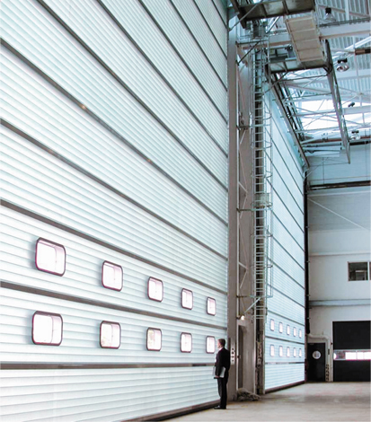 A unique German upward acting door with panels stacked neatly behind the lintol when open, the translucent GRP door panels of the Butzbach Stacking Door offer excellent diffused daylight emission, as well as heat and sound insulation.