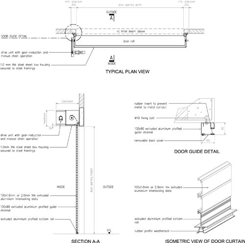The door curtain is made up of sturdily designed extruded aluminum flat-faced interlocking slats, 100mm high x 1.6mm or 2.0mm thick. These slats are also available with ventilation slots, with or without clear acrylic or polycarbonate inserts.