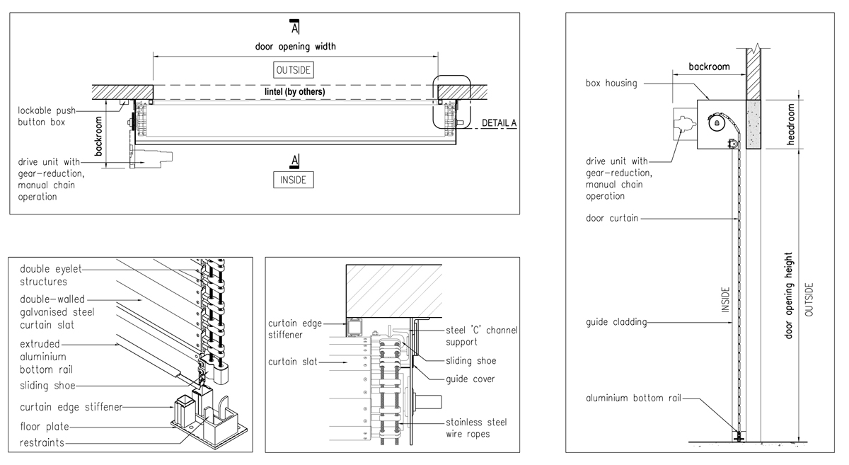 The drive unit consists of a suitably-sized linear drive motor operator mounted parallel to and behind the door roll. It has an integrated gearbox and a chain operated sheave wheel for manual operation in case of power failure. The control box is lockable, housing a set of push buttons for Up’, ‘Down’ and ‘Stop’ operations. The door operation shall automatically stop at the desired upper and lower limits via adjustable limit switches.